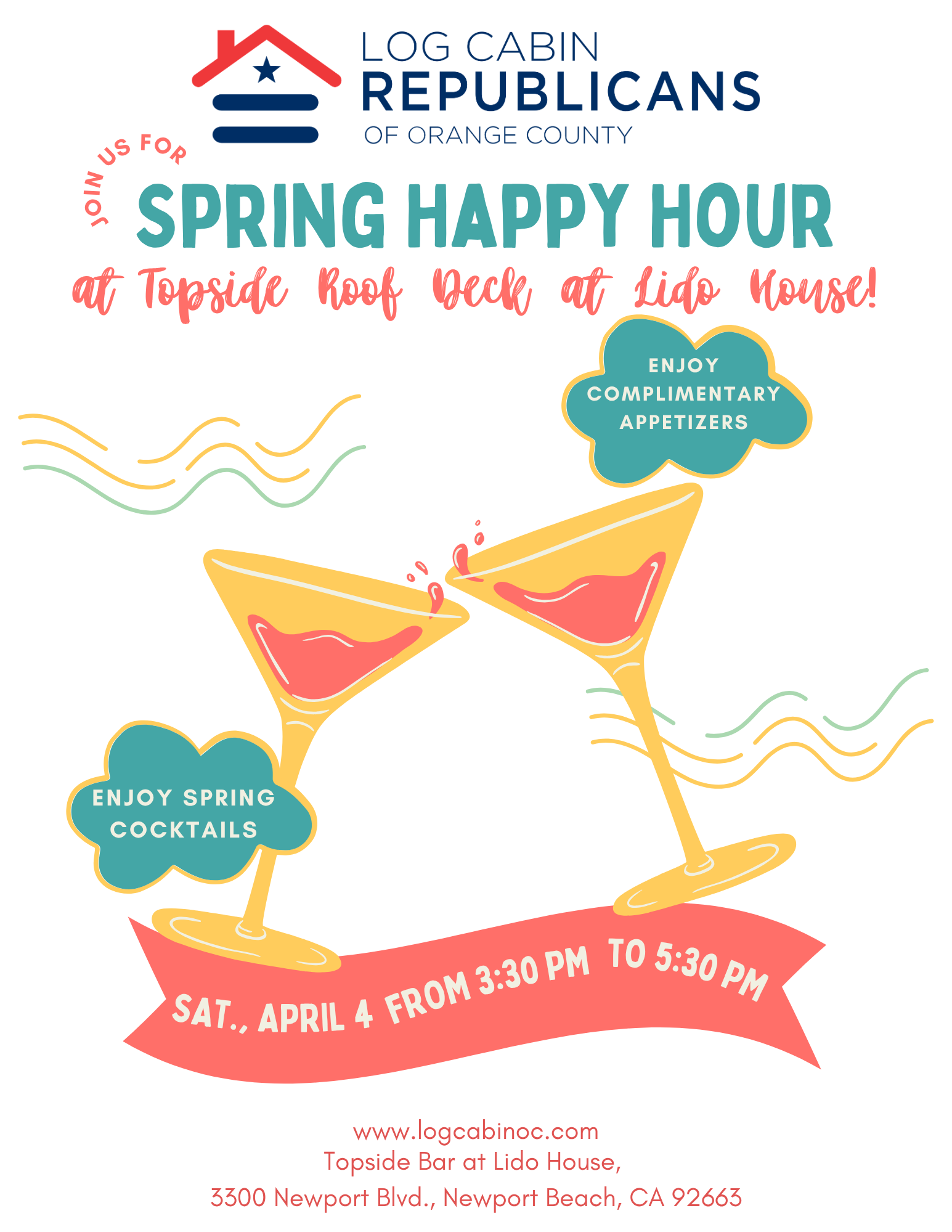 Join the Log Cabin Republicans of Orange County for a relaxed afternoon happy hour at Topside Bar, located at Lido House, on Saturday, April 4 from 3:30 to 5:30 p.m. Enjoy great company, ocean views, and complimentary appetizers as we connect and unwind together in Newport Beach. This is a great opportunity to connect with fellow members, meet new faces, and enjoy an easy weekend social event.