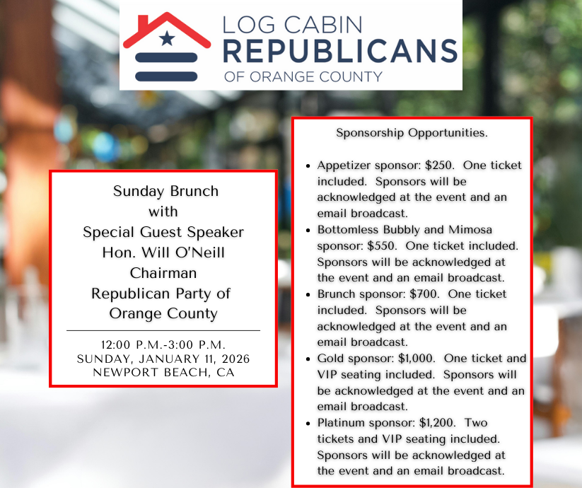 Log Cabin Republicans of Orange County invite you to our Sunday Brunch with Special Guest Speaker Hon. Will O’Neill Chairman - Republican Party of Orange County. "Hon. Will O’Neill was elected as Chairman of the Republican Party of Orange County in 2025. He previously served on the Newport Beach City Council from 2016-2024, having served as Mayor in 2020 and 2024" (The Republican Party of Orange County).